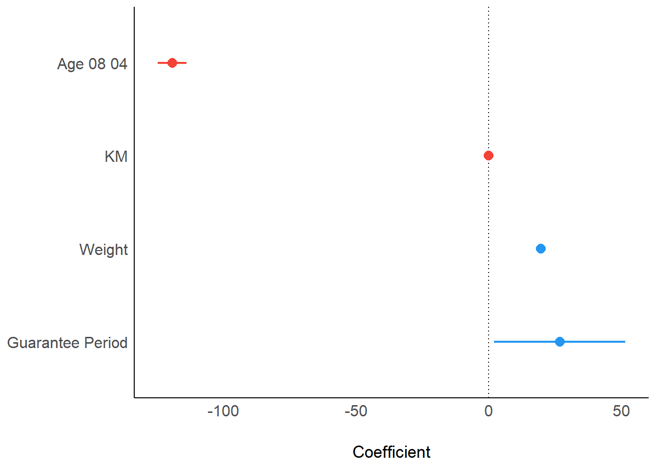 lm(formula = Price ~ Age_08_04 + Mfg_Year + KM + Weight + Guarantee_Period,