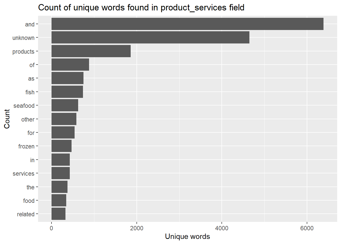 token_nodes %>%count(word,sort =TRUE) %>%top_n(15) %>%# reordered according to the values in the n variablemutate(word =reorder(word,n)) %>%ggplot(aes(x=word,y=n))+geom_col()+xlab(NULL)+coord_flip()+labs(x ="Count",y ="Unique words",title ="Count of unique words found in product_services field")