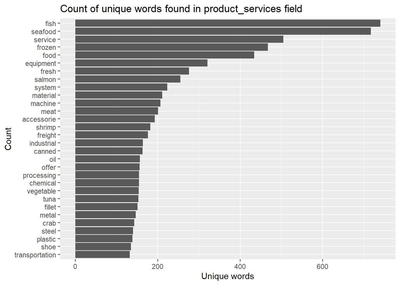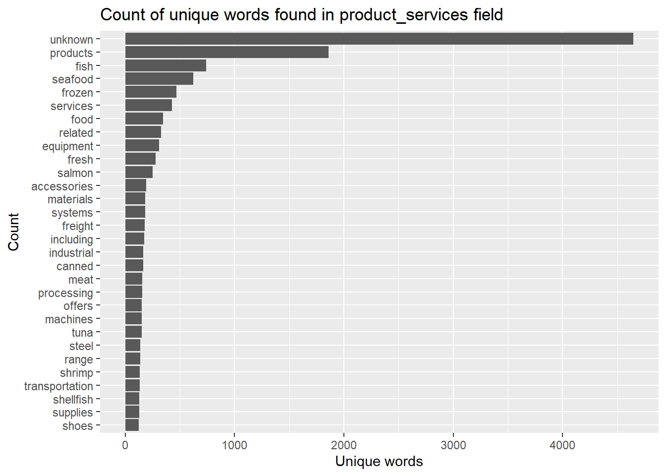 stopword_removed_2 %>%count(word, sort =TRUE) %>%top_n(30) %>%mutate(word =reorder(word,n)) %>%ggplot(aes(x=word,y=n))+geom_col()+xlab(NULL)+coord_flip()+labs(x ="Count",y ="Unique words",title ="Count of unique words found in product_services field")