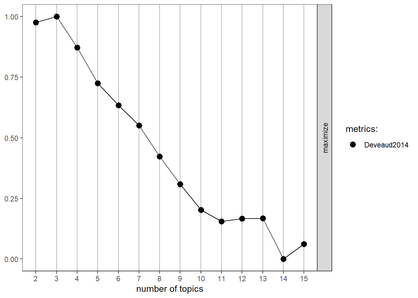 result <- ldatuning::FindTopicsNumber( DTM,topics =seq(from =2, to =15, by =1),metrics ="Deveaud2014",method ='Gibbs',control =list(seed =1234),verbose =TRUE)