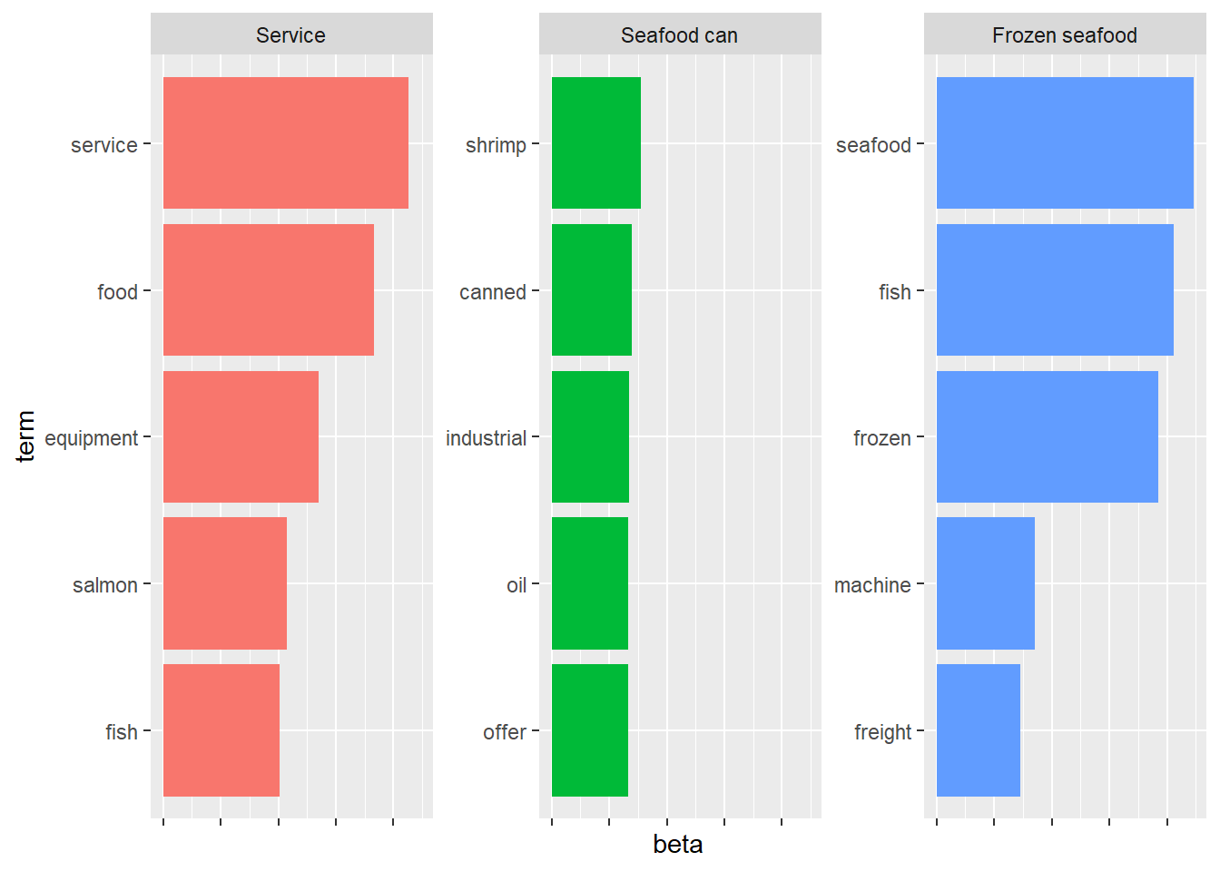 # see the probability of each word belonging to each topictopicmodel_tidy <-tidy(topicmodel,matrix ='beta')# find top 5 words with maximum probability in each topictop_terms <- topicmodel_tidy %>%group_by(topic) %>%slice_max(beta, n =5) %>%arrange(topic, -beta)# visulize by ggplottop_terms %>%mutate(term =reorder_within(term,beta,topic)) %>%ggplot(aes(beta, term, fill =factor(topic)))+geom_col(show.legend =FALSE)+facet_wrap(~topic, scales ="free_y",labeller =labeller(topic =c("1"="Service", "2"="Seafood can", "3"="Frozen seafood")) )+scale_y_reordered()+theme(axis.text.x =element_blank())