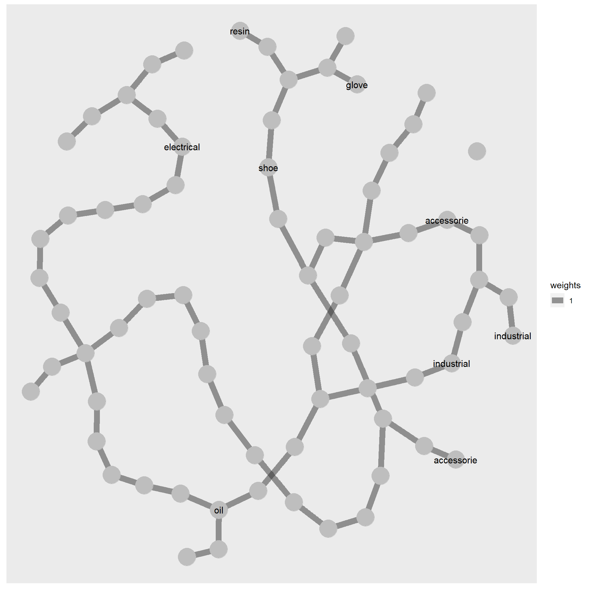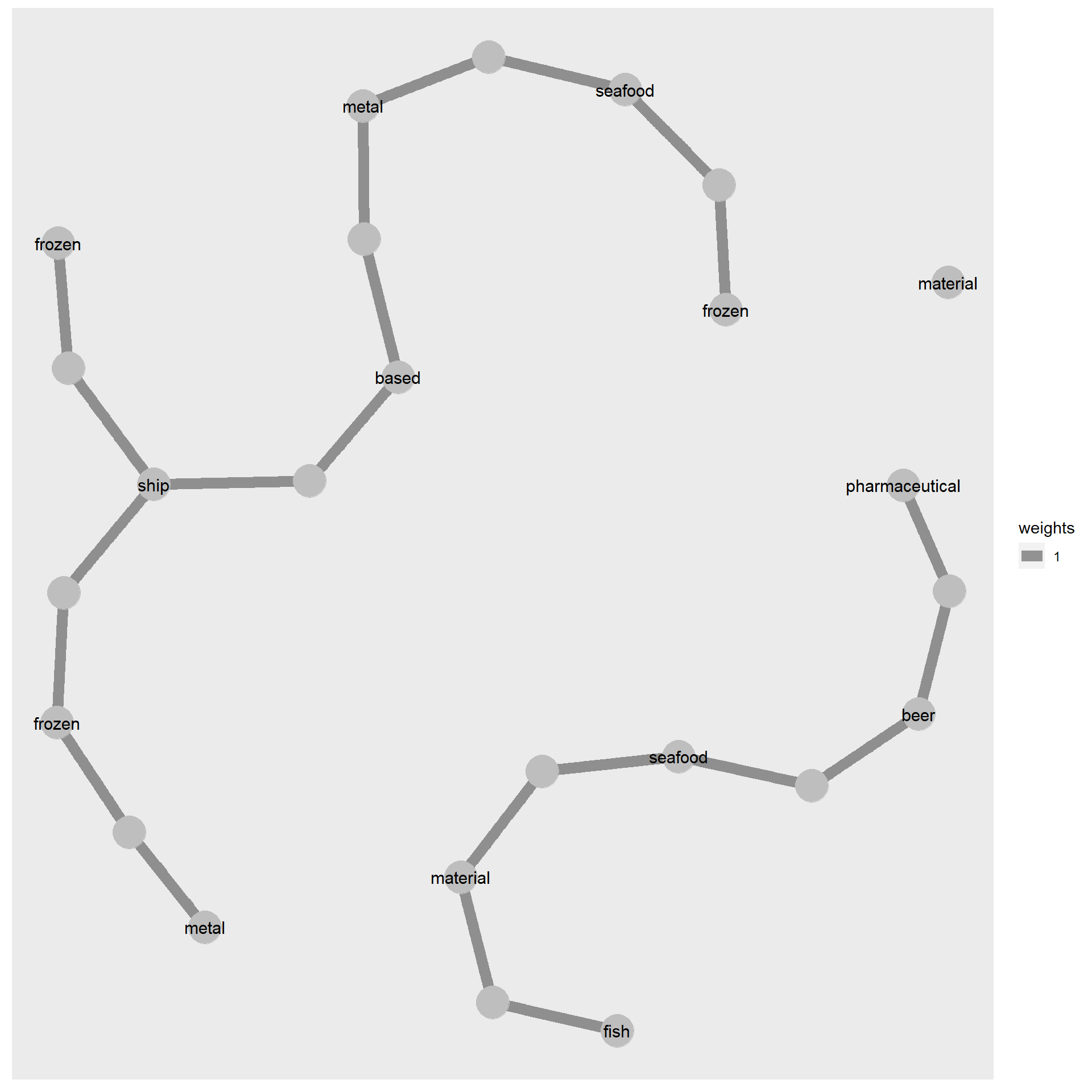 extended_stopwords <- stop_words %>%bind_rows(data.frame(word =c('unknown','related','including','range','products')))stopword_removed_2 <- token_nodes %>%anti_join(extended_stopwords)#remove s at the end of each wordstopword_removed_2$word <-gsub("(.*)s$", '\\1', stopword_removed_2$word)
